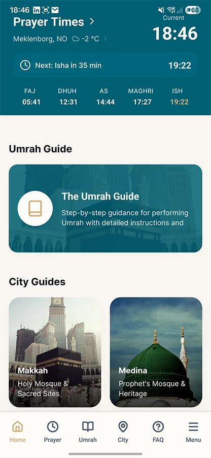 The Umrah Guide app is the ultimate Umrah companion — step-by-step guidance, authentic duas with audio recitations, English translations, prayer times, and city guides for Makkah and Medina, all in one beautifully designed app.